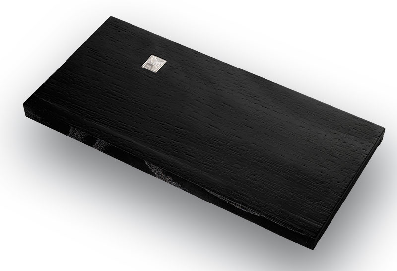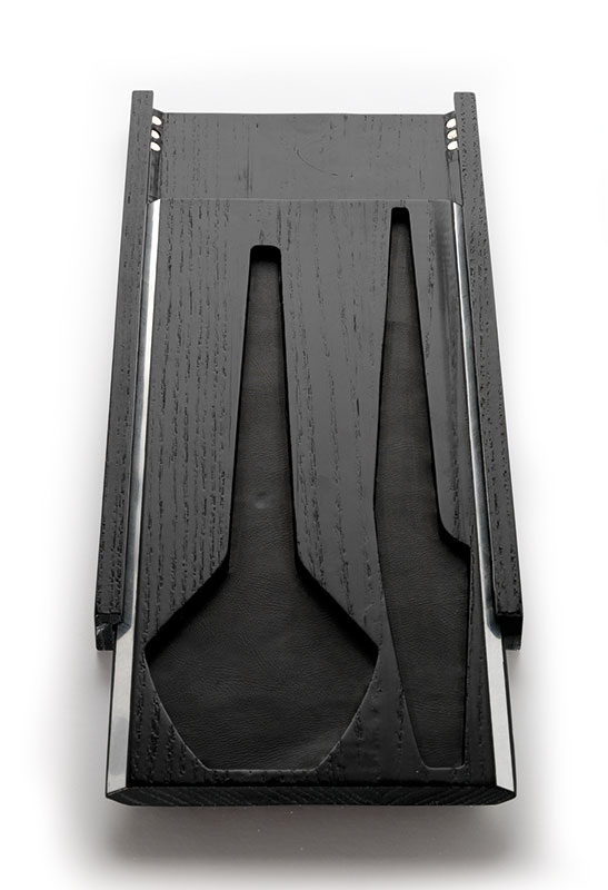 Nel progetto Stele, per traslare la scatola Double dalla sua mera funzione di contenitore e renderla al contempo un prezioso espositore, si è scelto di utilizzare il legno massello di frassino con finitura di colore nero: un materiale sufficientemente pregiato che mette in contrapposizione le proprie caratteristiche di "calore" con la freddezza degli oggetti metallici; il colore nero faceva inoltre risaltare in modo convincente i riflessi di luce generati dalle finiture satinato e lucido del metallo.